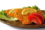 Schweineschnitzel paniert, Mozzarella, frische Tomaten, Sahnesauce, mit Käse überbacken |