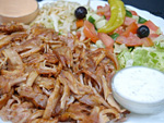 Gyros, dünn geschnittene Schweineleber mit gebr. Zwiebeln, Reis, Pommes, Krautsalat, Tzatziki |